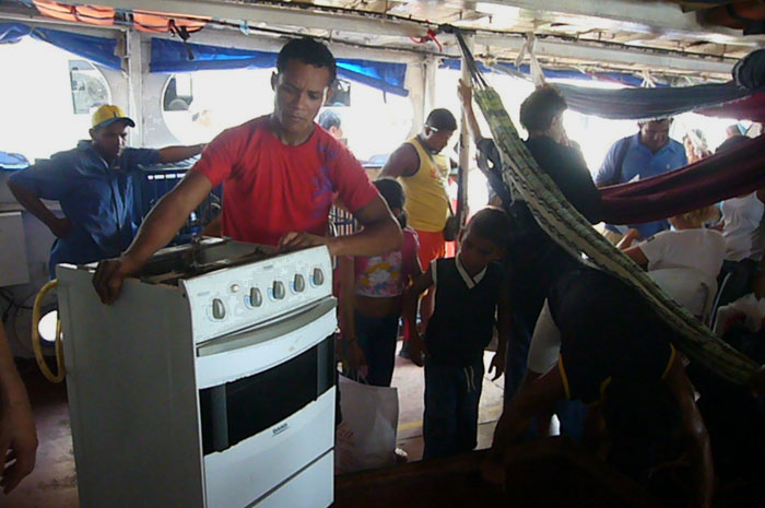 Because the river is the highway of the Amazon the little boy (in the dark) is moving with his family by boat to another city on the river. He is looking anxiously at his stove being moved!