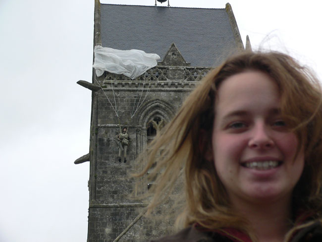 En route pour aller voir Eve en Angleterre, avec Jessica et Lorraine, nous sommes passés par "Sainte Mère Église" avec le parachutiste sur le clocher de l'église du Jour-J