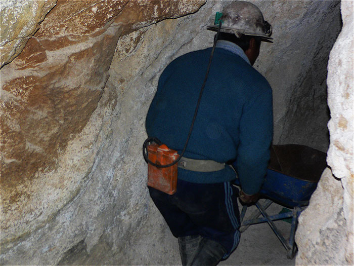 à l'intérieur du tunnel étroit, les minéraux sont transportés à la brouette.