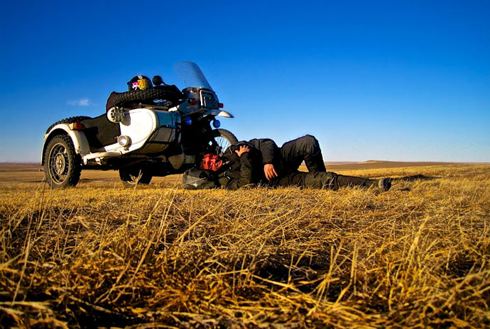 "You know, I missed you a lot these last couples of days, mostly in the sand track too deep and too soft near the border... but also in the climb of a stiff cliff. It was way to stiff for us, and I was very lonely in the middle of it without escape. Fortunately, the rangers of the park came to my rescue with their Toyota Land Cruiser. They pulled me to the top, me in neutral but lying down on the sidecar because the slope was dangerously going the wrong way not to mention the ditches. It was quite scarry ! Saint Ural, give us an engine Toyota on our sidecars and a really short 1st gear ;-)"