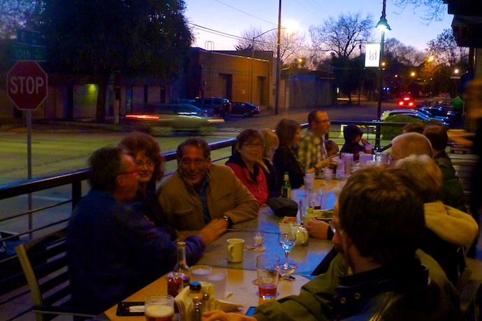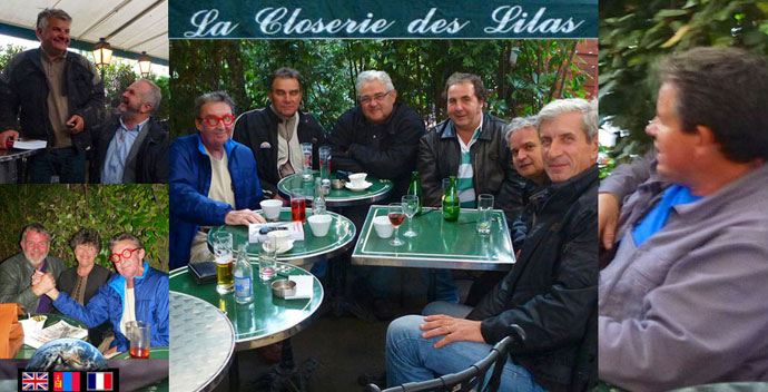 A dozen well travelled bikers meeting at the Closerie des Lilas in Paris.