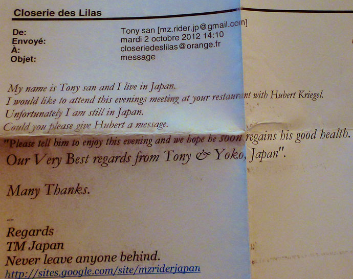 Thank you Tony, your email send from Tokyo to the Closerie des Lilas last tuesday was delivered to me