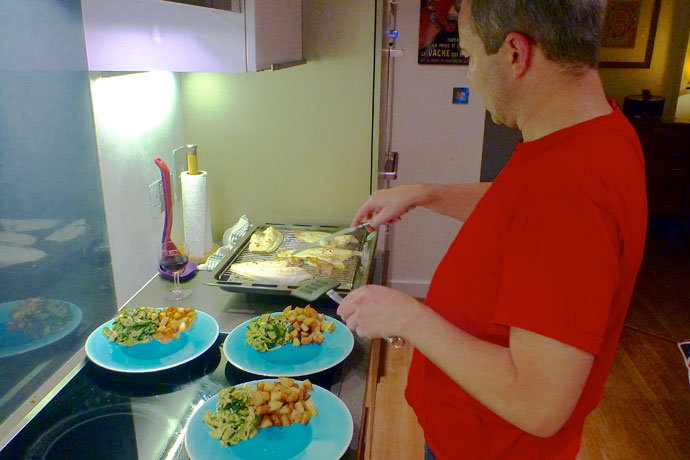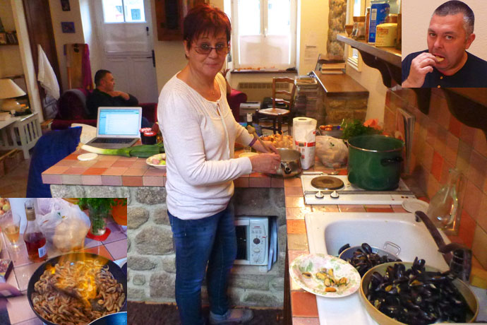 We had Pascal and Renée from Caen, a couple I know from internet, I never met before, Ural afficionados who come for lunch. As soon as they arrived, I put Renée in the kitchen to do a complicated recipe for the "Barfleur Mussels" - the mussels are cooked in white wine, lay (without the shell) in a pan over a layer of local leak with a lot of cream and you finish the cooking in the oven. For starter, I found local live little shrimps (bottom left), cooked in hot butter and sprinkle with burning cognac. Pascal (top right) at that time was just the tester !!! After a digestive walk around the harbour under the rain (normal here), they went home at the end of the afteroon a couple of hours away.