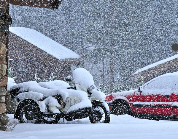8h00: La temperature dehors est de -27ºC. Mon sidecar a dormis a l'interieur mais le Guzzi a dormis dehors. Le starter du cote droit est bloque et leur battery est morte. J'adore ces mecs, avec un grand sourire ils me disent "On a un petit probleme!"