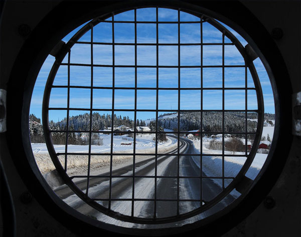 14h00: Je suis a 200km du Cercle Polaire. La route est bonne mais je ne vais pas vite, c'est glissant au possible sur cette petite route etroite avec des voitures et camions tres regulierement. Je me maitiens dans les 65kmh et la temperature est entre -10ºC et -5ºC, merci au Gulf Stream pour ces courants chauds.