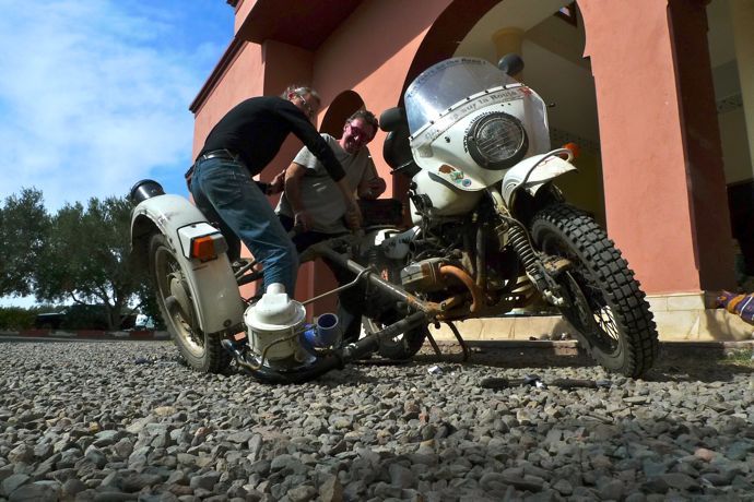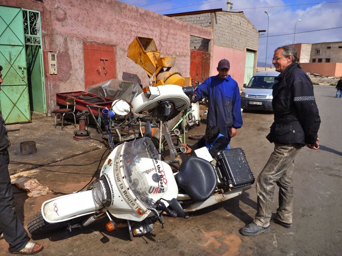 La bonne nouvelle de la journee fut quand je decouvri que le cadre du sidecar etait fendu au meme endroit que la reparation que j'avais faite au Kyrgyzstan il y a 2 ans. C'etait une bonne nouvelle parceque le cadre etait fendu mais pas encore casse et que nous etions dans une grande ville avec plein de gens competent et equipés pour souder mon sidecar. Apres tout, il aurait tres bien pu casser en plein milieu du desert !!!