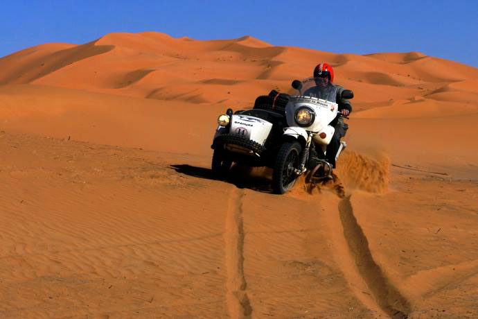 "Erg Chebbi" est un immense complexe de dunes proches de la frontiere Algerienne. Notre 2WD Ural sidecar ne nous permet que de jouer dans le bac a sable de ces dunes, seules les motos "Enduro" peuvent aller a leurs sommets.
