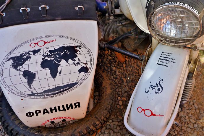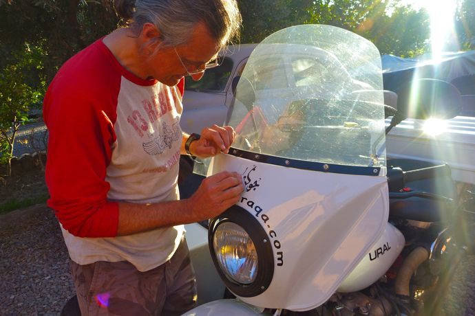 Enfin, Jean-Louis met des auto-collants sur son sidecar!