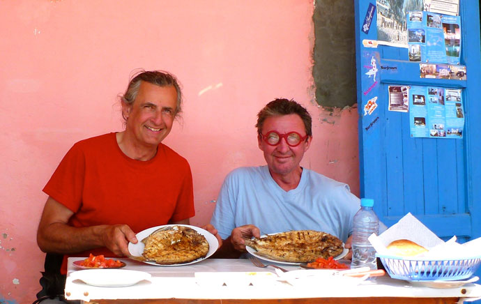 We just arrived in Agadir. The ride along the Moroccan coast is magnificient and either we eat fish or we eat fish !!! |