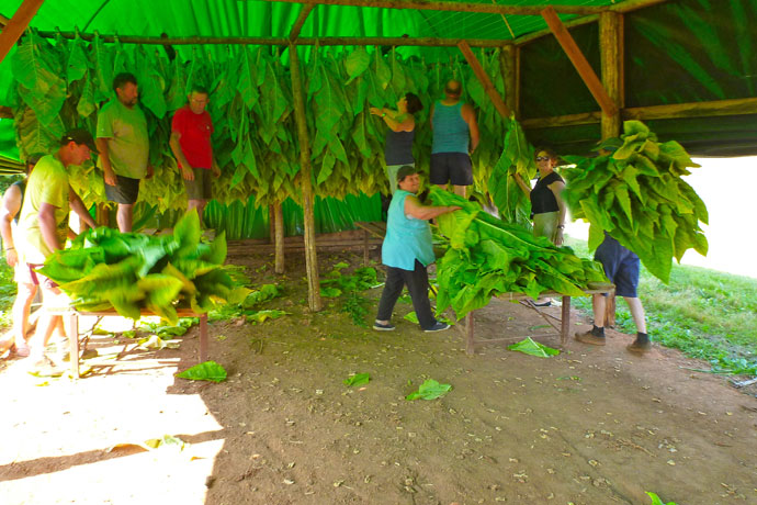 Avec toute l'équipe du Pelonier, on suspend les pieds de tabac pour les faire sécher.