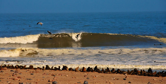 Hugues (Français) dévale les vagues de Cap Cross en Namibie comme un phoque.