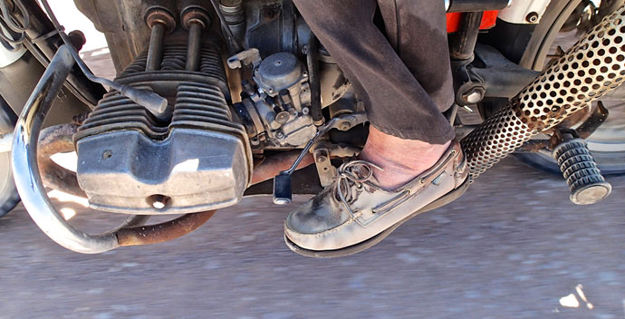 Apres avoir chargé la batterie pendant la nuit, je n'avais pas d'electricite en mettant la clef de contacte. Apres avoir un peu tourné en rond, je me suis rendu compte que j'utilisai le coupe circuit que j'avais pour la batterie d'hiver que j'utilsai dans les pays froid comme la Mongolie. Comme on avait bien vidangé les carburateur avant de partir l'annee derniere, il m'a suffit de souffler un coup dans la tuyauterie carbu > reservoir pour les realimenter en essence. Le moteur a alors demarré du premier coup.