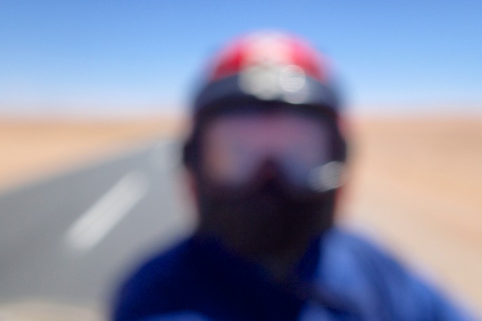 Jusqu'à 50 km de la côte, les vents violents qui habitent Lüderitz froment en fait une saloperie de tempête de sable difficile à gérer en moto. En y allant, je n'étais pas préparé mais pour le retour (Lüderitz est un cul de sac), mon tour de cou en polaire, et les lunettes de ski (de Sibeérie) m'ont parfaitement protégés le visage. Ne portant pas mes lunettes rouge, je n'ai pas vu que mon appareil photo était sur macro mais je vous garantie, ça a été très efficace!!! |