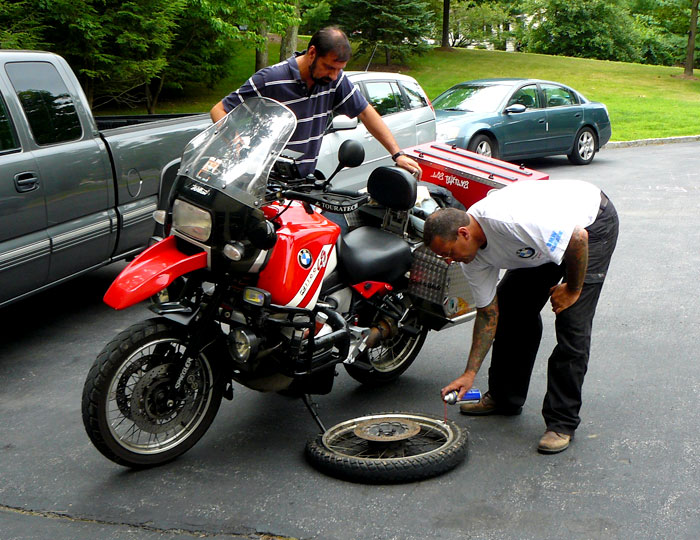 During that time, Didier and David took care of changing my tires. 1 - Spray WD40 on the rim...