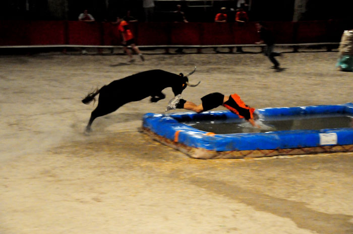This is called the "swimming pool fight", the bulls are young and their horn are protected. The youth of the village play to attract the bulls in the swimming pool... by giving the good example...
