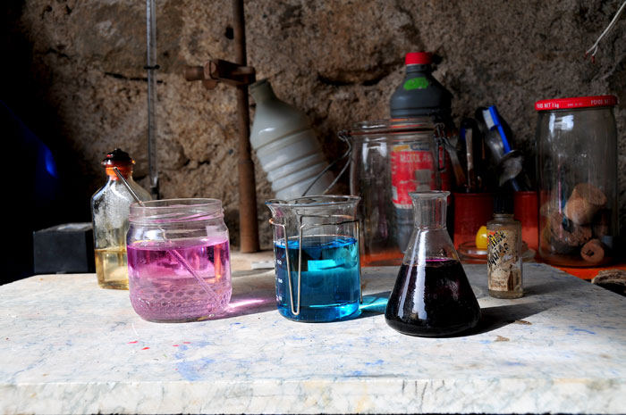 Bernard set up a chmistry counter to make some experiments with his grand son Adrien.