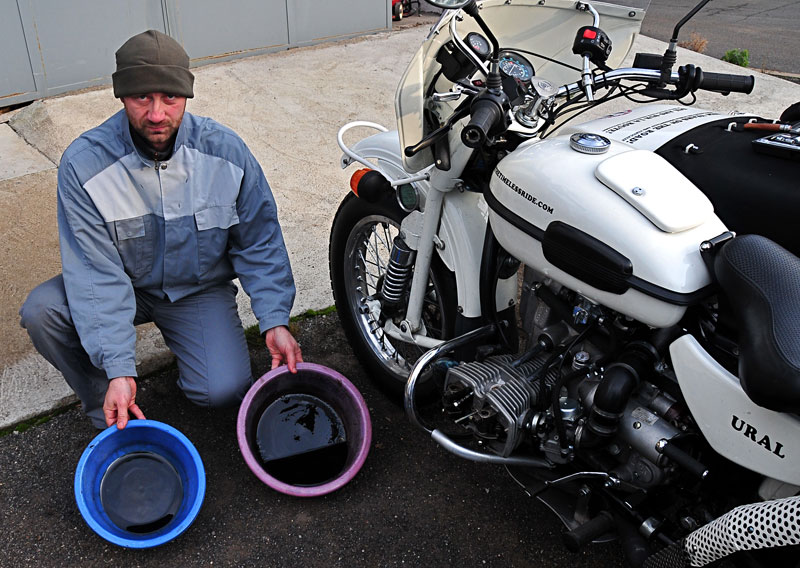 Bruno has a lot of humor (except when he works). He showed me a big problem. When opening the cylinder covers, to tighten the studs after my 300 miles from Geneva, the left side was normal but the right side had 1/2 a quart of oil!