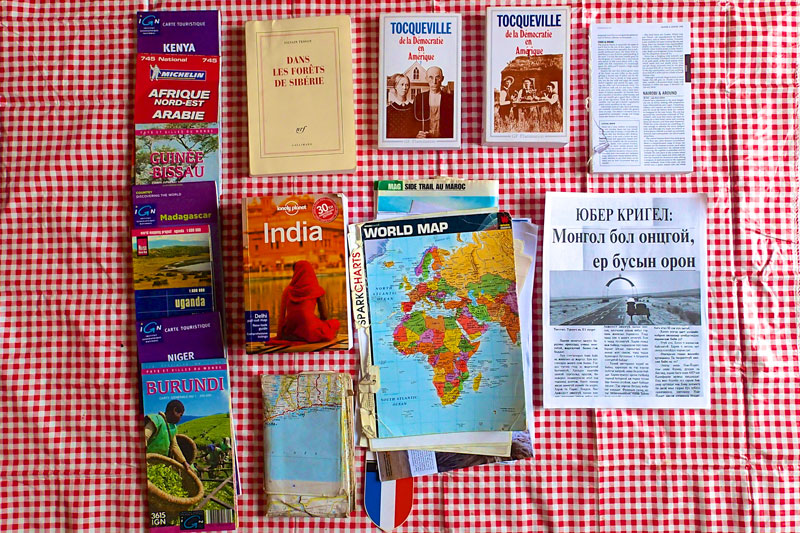 Livres, cartes, articles moto et le guide Lonely Planet de l'Inde - Dégagés (désolé Jessica).