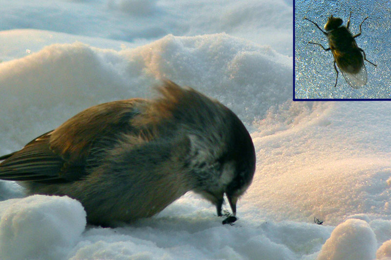 Quand la cabane s'est réchauffée, les mouches ont fait surface par centaines. J'ouvrais la fenêtre, elles s'envolaient dehors et par -40ºC elles tombaient mortes dans le premier mètre. J'en nourissais mes 2 oiseaux tous les jours
