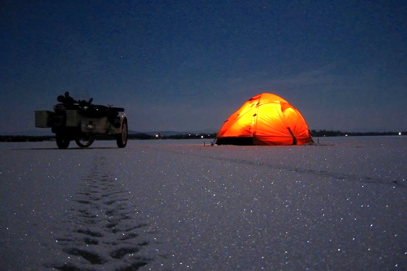 Ça c'est la récompense! Dormir sur un lac de glace... il suffit de savoir que les sinistres craquements de glace que vous entendez toutes les quelques minutes est un phénomène normal!
