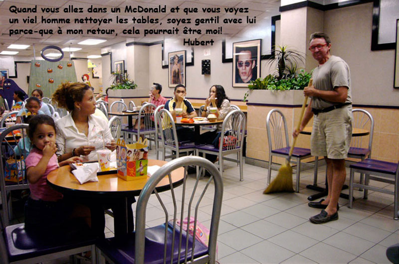 McDonald ou autre. Il se fait que ma retraite est le montant de mon budget voyage alors je suis sur la route jusqu'au bout... !!!
