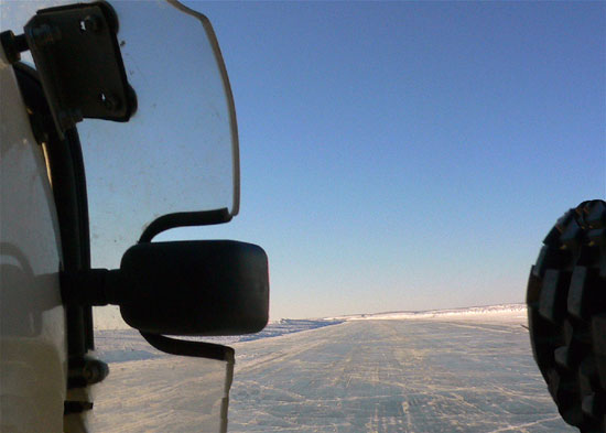 Comme vue par mon genou droit... approchant Tuktoyaktuk sur la route de glace. Regardez la vidéo que j'ai faite ce jour-là démontrant ma discipline écologique