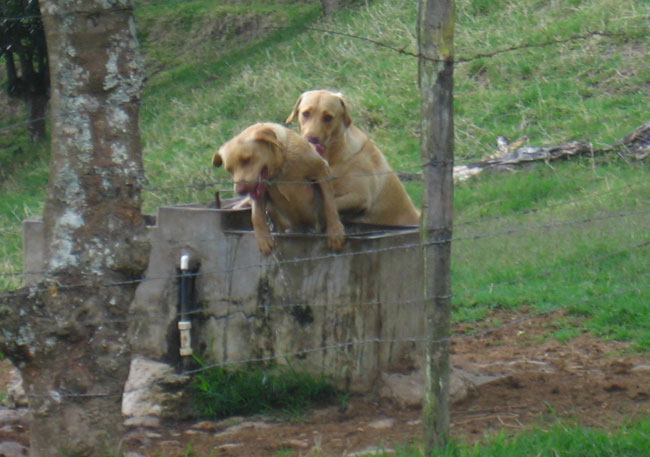 Mes 2 copains, les labradors, ont trés chauds après avoir tant couru dans la montagne, ils se sont jetés dans l'eau de l'abreuvoir avec grand plaisir