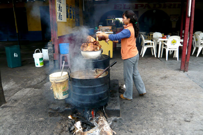 Sur le bord de la route, une fumée est toujours une invitation. On dirait du porc...