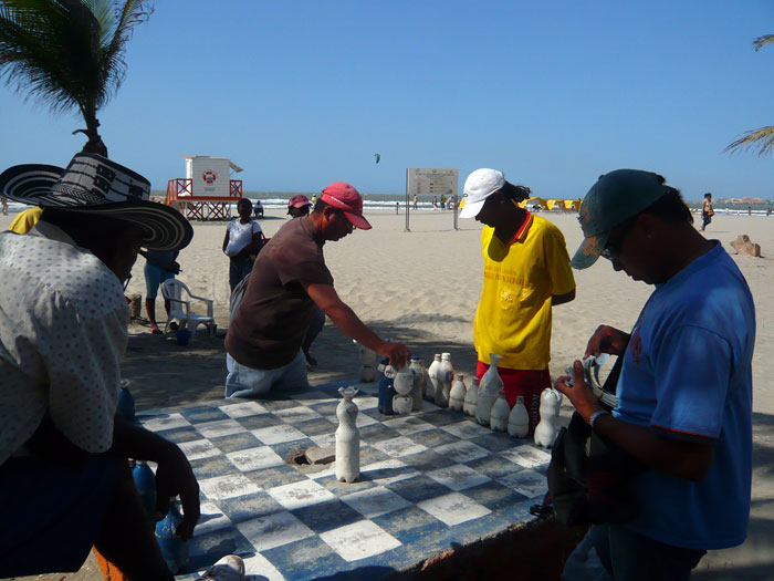 Les gens ordinaires jouent aux échecs sur la plage avec des bouteilles en plastique.