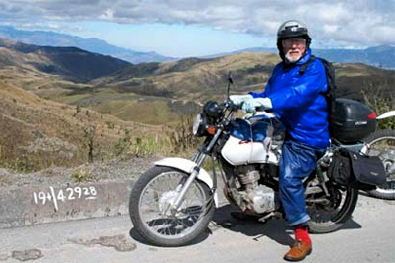 At 72, Simon was not a biker, he bought his Honda 125cc Pizza bike in Mexico and drove down to Ushuaia and back to UK.