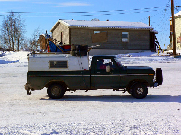 He slept outside with his dogs on the frozen Peel River and was coming back from the dump where he founds the 2 needed tires for his pick-up truck.